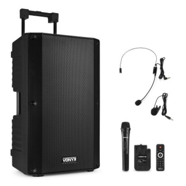 La serie Vonyx VSA (12”/15”) è un sistema audio portatile con Bluetooth, USB/SD MP3, display ID3, batteria ricaricabile e 2 microfoni UHF. Offre molti ingressi/uscite e controlli, con struttura robusta su ruote e maniglia per il trasporto